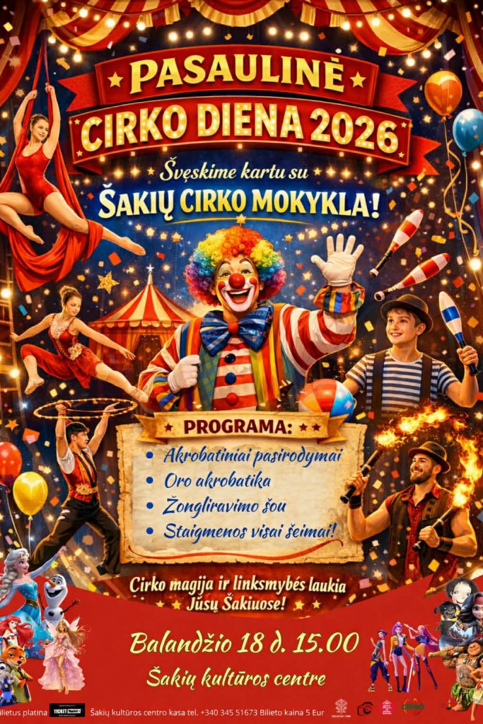 Šakių cirko mokykla kviečia kartu švęsti Pasaulinę cirko dieną su animaciniais personažais -tai spalvinga, linksma ir kupina nuotykių šventė, skirta vaikams ir visai šeimai. Renginio metu cirko mokyklos mokiniai demonstruoja savo talentus: akrobatiką, žongliravimą,...